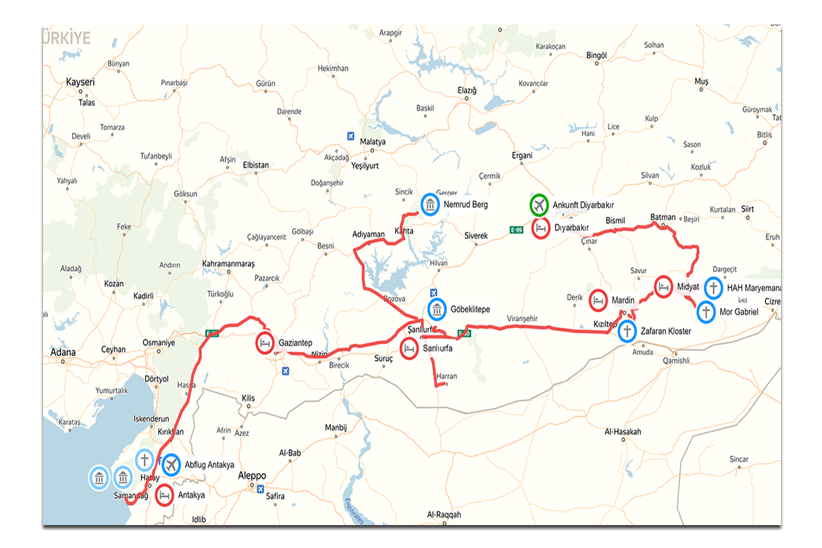 Nach dem Frühstück fahren wir nach Urfa im biblischen Gebiet Harran. Nach den Überlieferungen wurde Abraham in Urfa geboren. Harran wird im Alten Testament erwähnt. Kurz vor Urfa in Göbeklitepe machen wir eine Reise in die Zeit vor etwa 11000 Jahren. Die Ausgrabungen und Entdeckungen von Prof. Klaus Schmidt lassen darauf schließen, daß hier Jäger und Sammler ihren ersten Tempel gebaut haben. Vermutlich wurde dieses Gebiet damals „ Garten Eden“ genannt. Nach einer interessanten Besichtigung des Ausgrabungsgeländes fahren wir weiter nach Urfa. Zu Mittag essen wir am Teich mit den Heiligen Karpfen. Sie werden hier eine bildhafte Legende hören. Nach der Besichtigung der Zitadelle können Sie den Handwerkerbasar von Urfa genießen. Abendessen, Übernachtung in Urfa. Tagesetappe ca. 200 km.