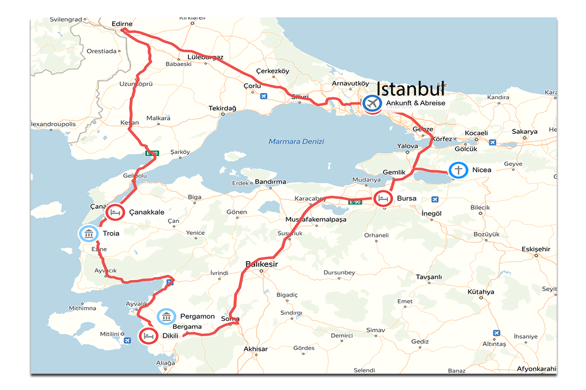 Nach dem Frühstück fahren wir nach Troia, der homerischen Stadt nahe beim Dardenellen mit anschließender Besichtigung der Verteidigungsmauern und den Resten aus der römischen Zeit. Danach geht die Fahrt weiter nach Pergamon, der Stadt, dıe eine von sieben Gemeinden der Offenbarung war. Dort besuchen wir das steilste Theater Anatoliens, den Trajan-Tempel u. v. m. Abendessen und Übernachtung in Dikili.